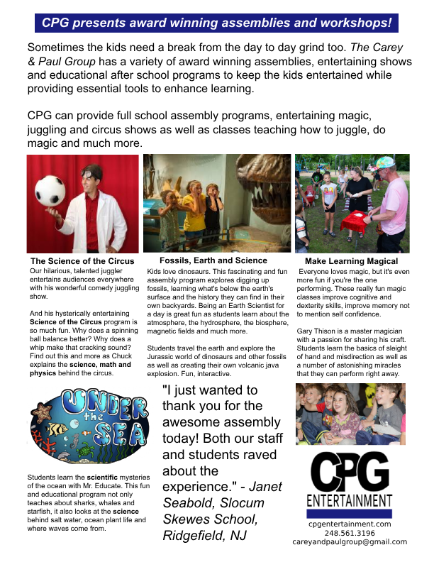 At the Carey & Paul Group, we believe that education and entertainment go hand in hand, creating a powerful and transformative experience for young minds. We are dedicated to providing top-quality assemblies, shows, classes, after school programs and workshops that are both entertaining and educational for schools and libraries.